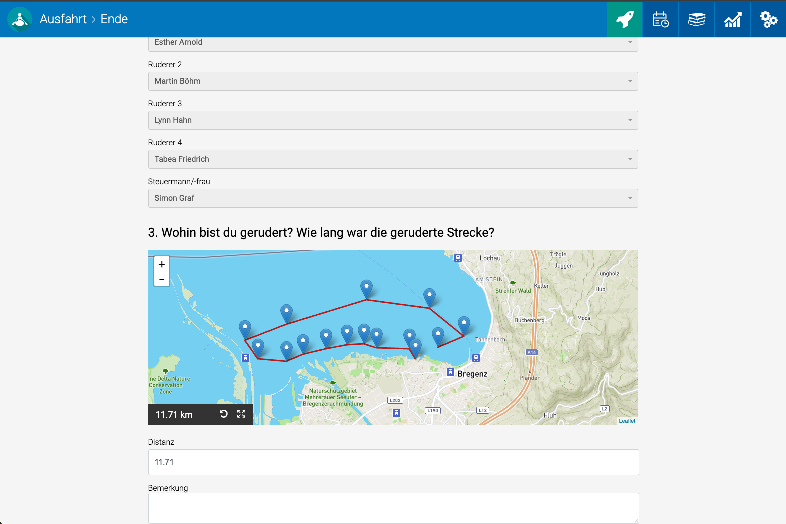 Bei der Entwicklung von rowLog standen immer die Nutzer im Fokus! Wir haben an alle Anwender gedacht: Die Administratoren haben die beste und einfachste Administratonsoberfläche zur Verfügung. Die Ruderinnen und Ruderer profitieren von der einfachen Eingabe und der einzigartigen Karte die eine metergenaue Aufzeichnung der geruderten Strecke ermittelt und dem Verein steht eine detaillierte Auswertung zur Verfügung.